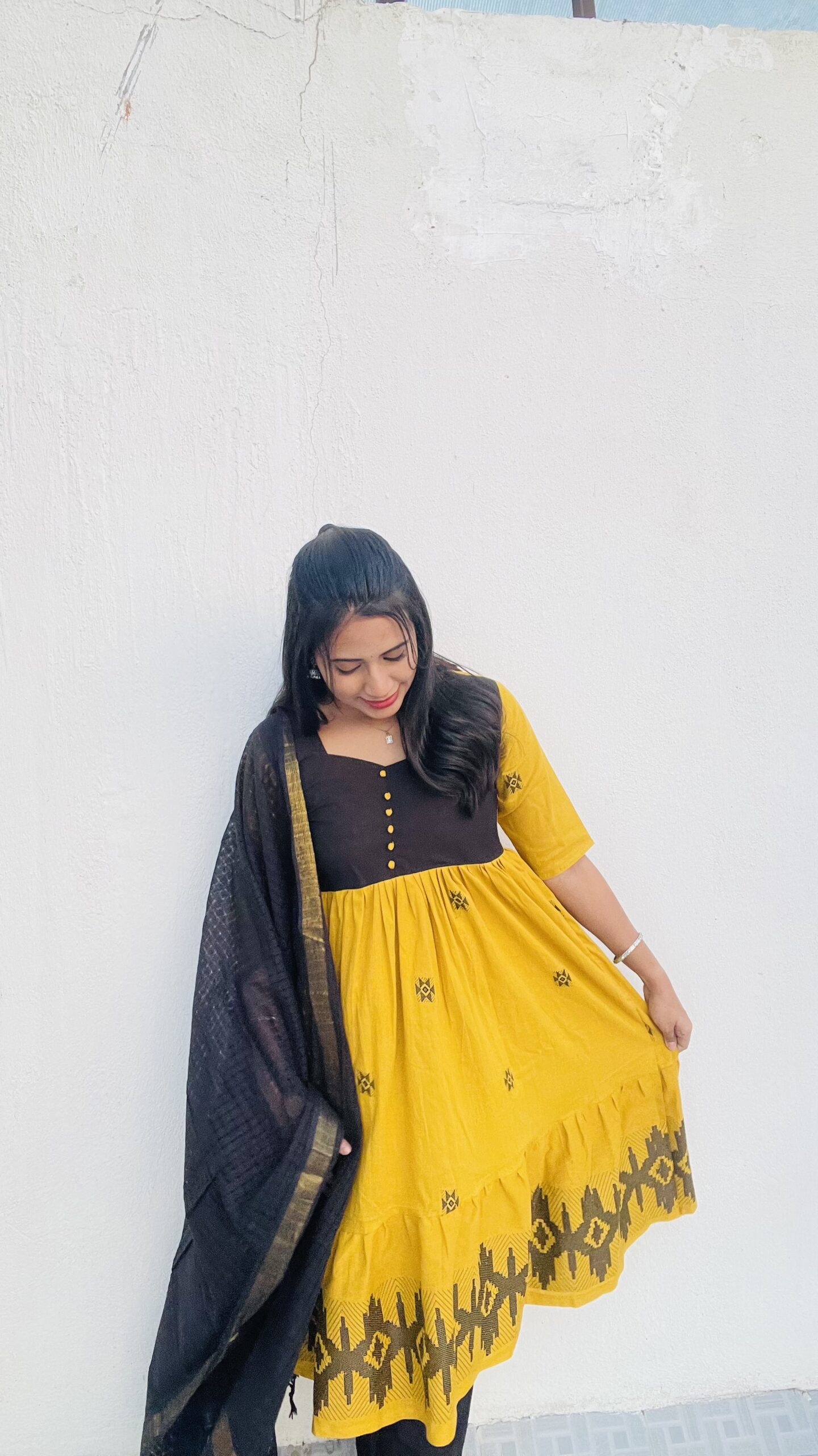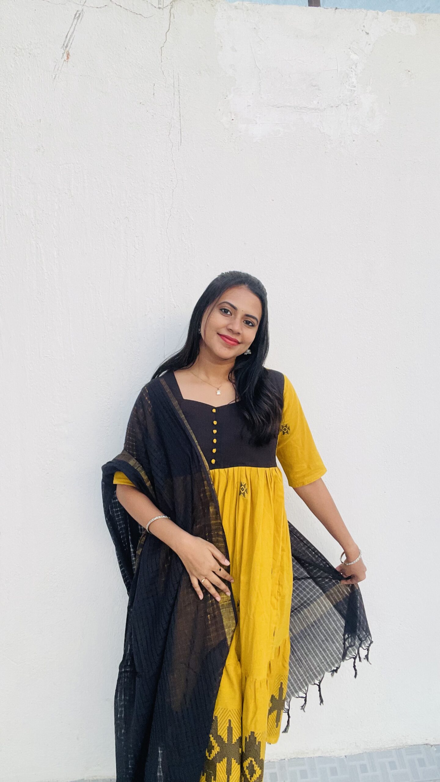 Step into comfort and style with this beautiful original handloom cotton Anarkali chudithar. Designed with a rich mustard yellow flare and a contrasting black yoke and dupatta, this outfit brings together traditional charm and everyday elegance. The soft cotton fabric makes it breathable and comfortable for all-day wear, while the handloom texture adds a natural, authentic feel. Perfect for casual outings, festive wear, and traditional occasions.