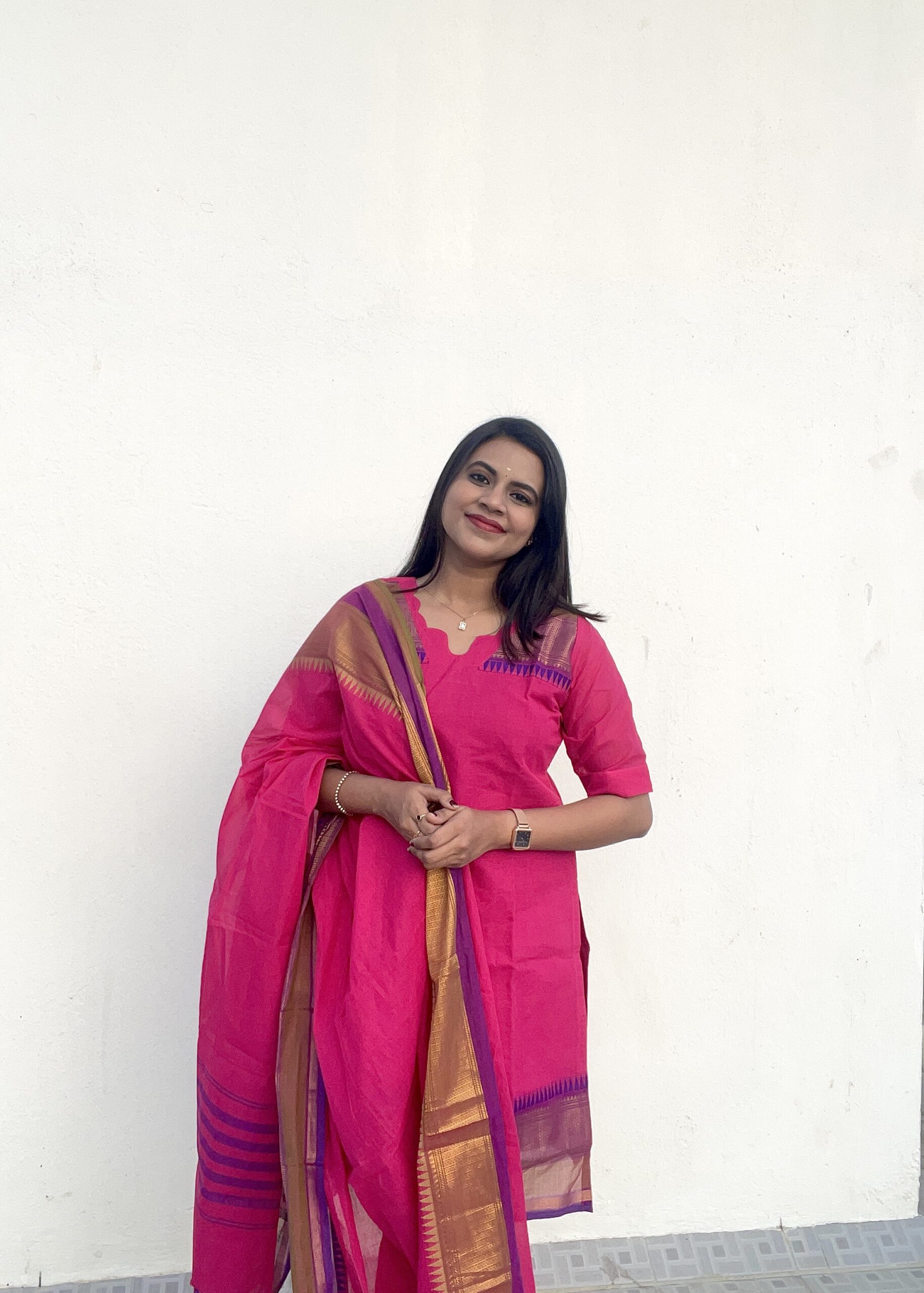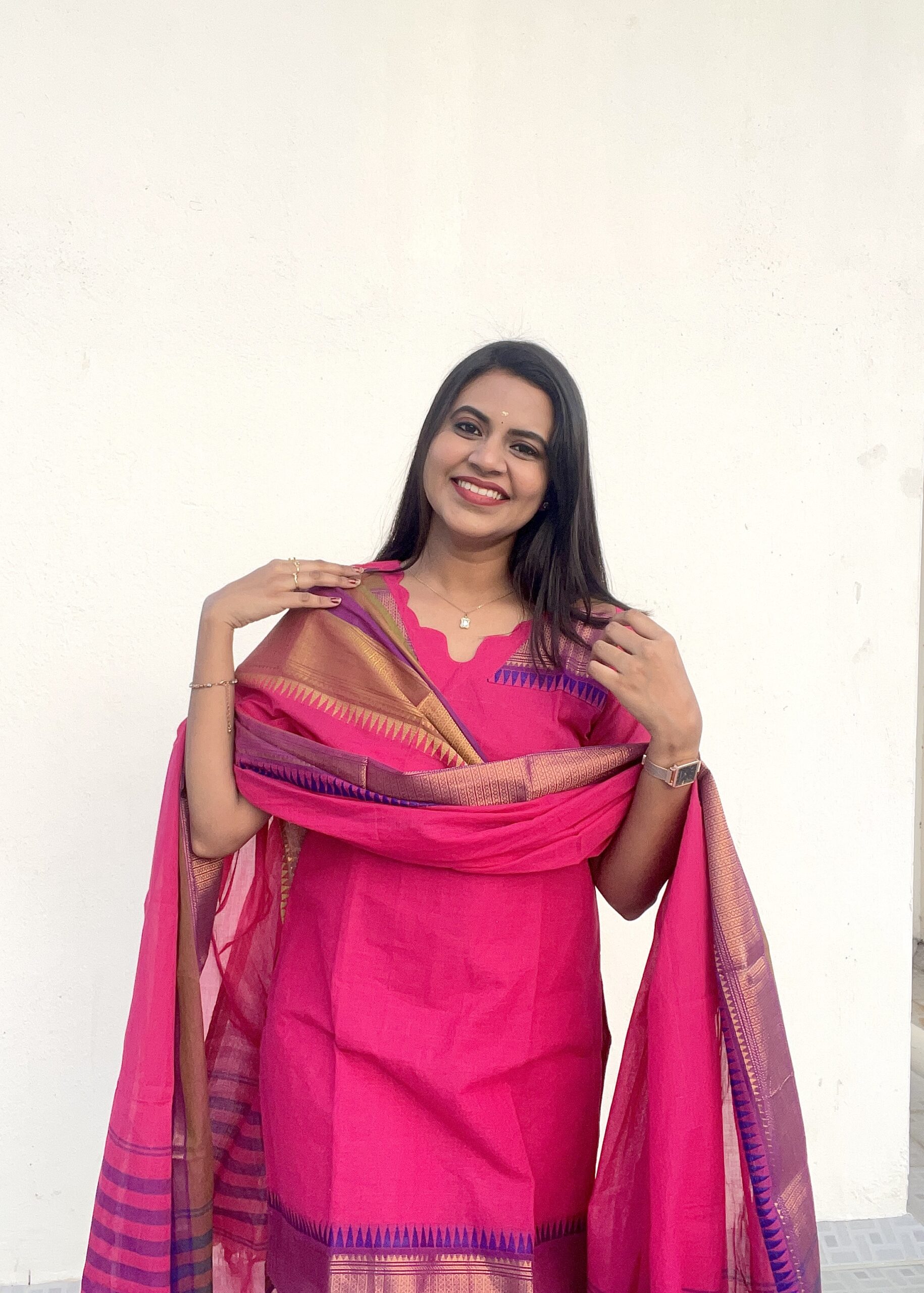 Elevate your ethnic wardrobe with this elegant Mangalagiri handloom set, designed for timeless grace and everyday comfort. The rich pink tone paired with a traditional zari-bordered dupatta creates a perfect blend of simplicity and sophistication.