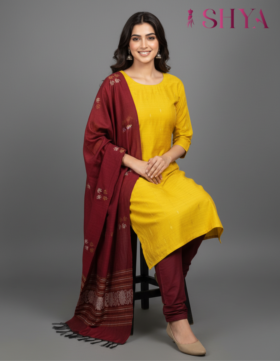 Pant: Contrast maroon pant that perfectly complements the kurti, offering a balanced and stylish finish.