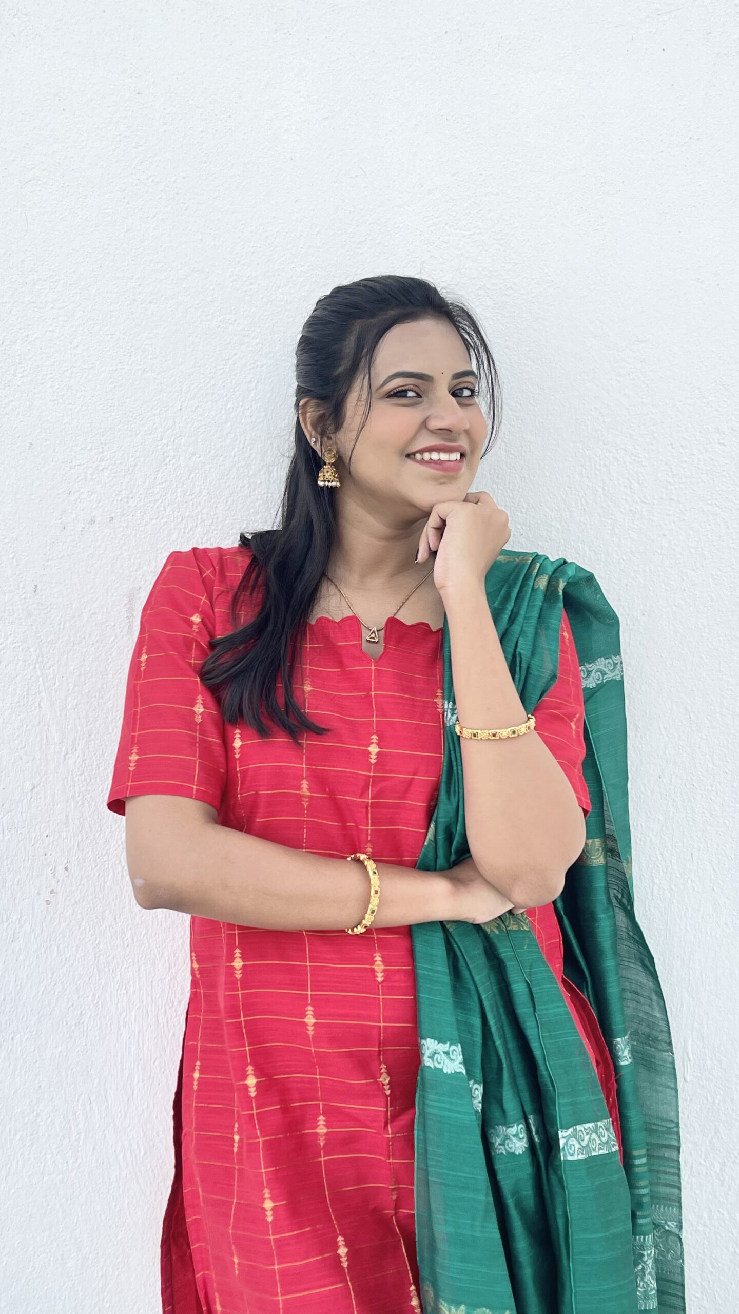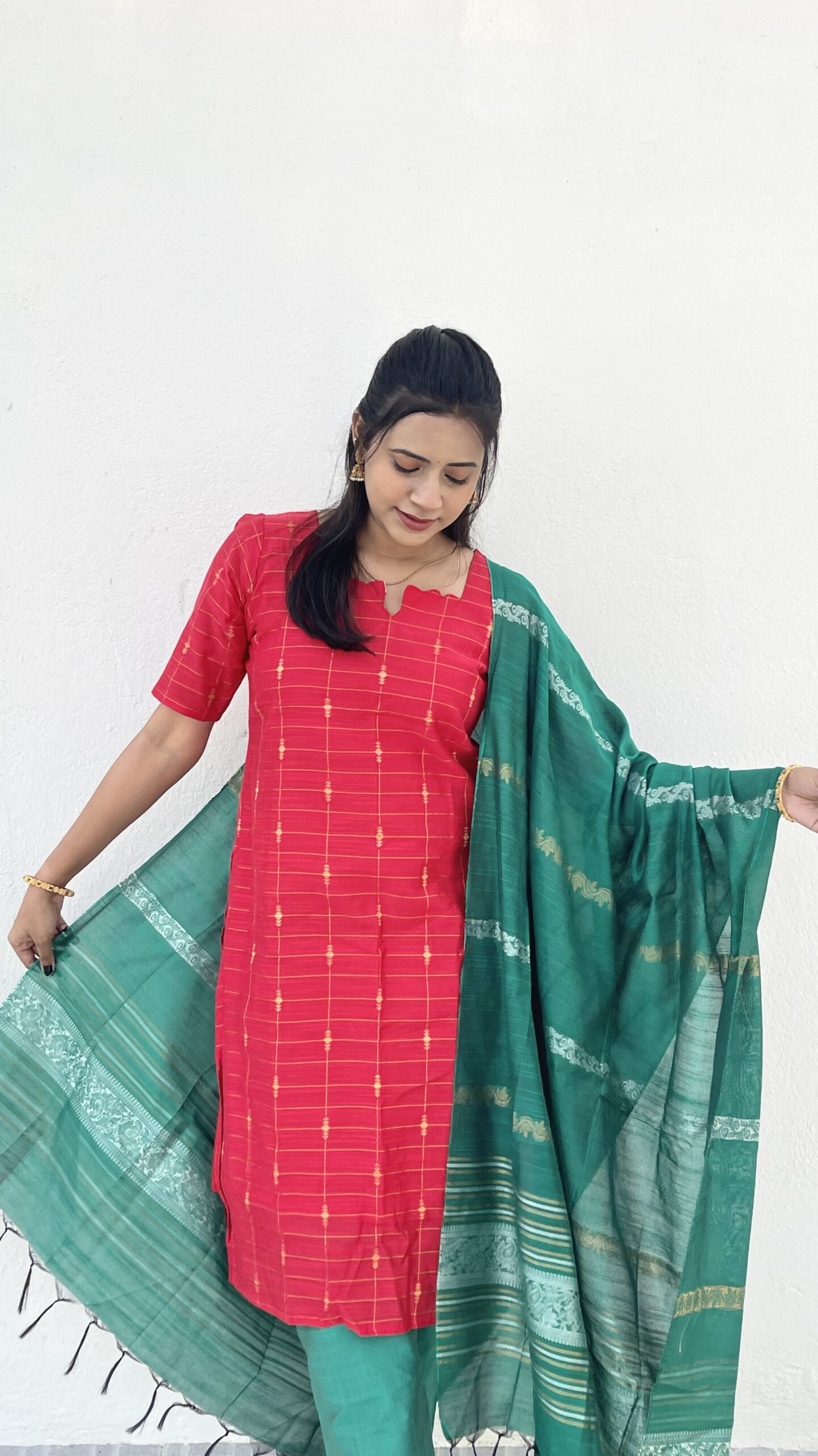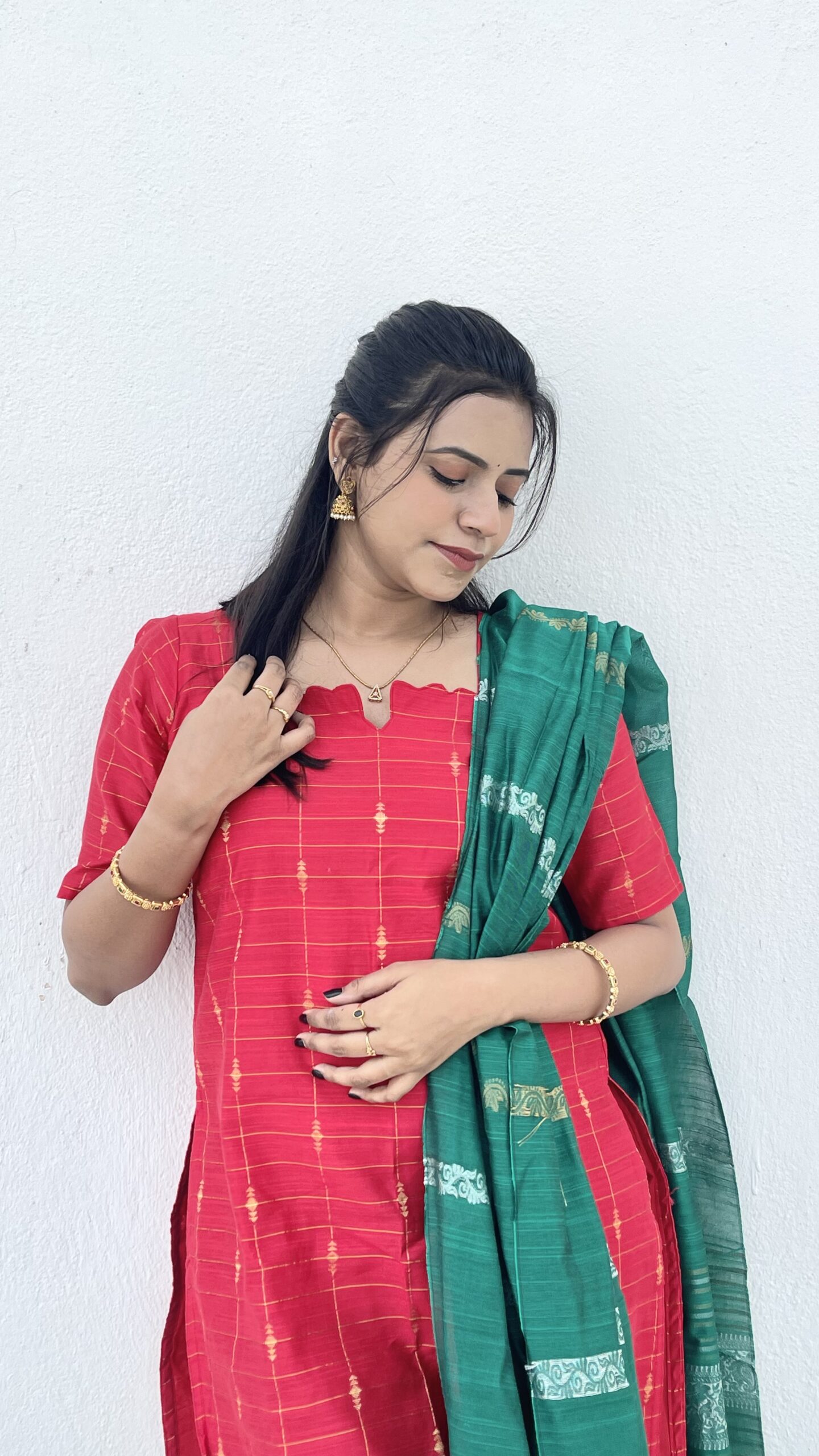 Elevate your ethnic wardrobe with this elegant and vibrant kurti set, crafted in premium raw silk fabric. The rich red kurti features subtle gold woven detailing, paired beautifully with a contrasting green designer dupatta for a graceful festive look.