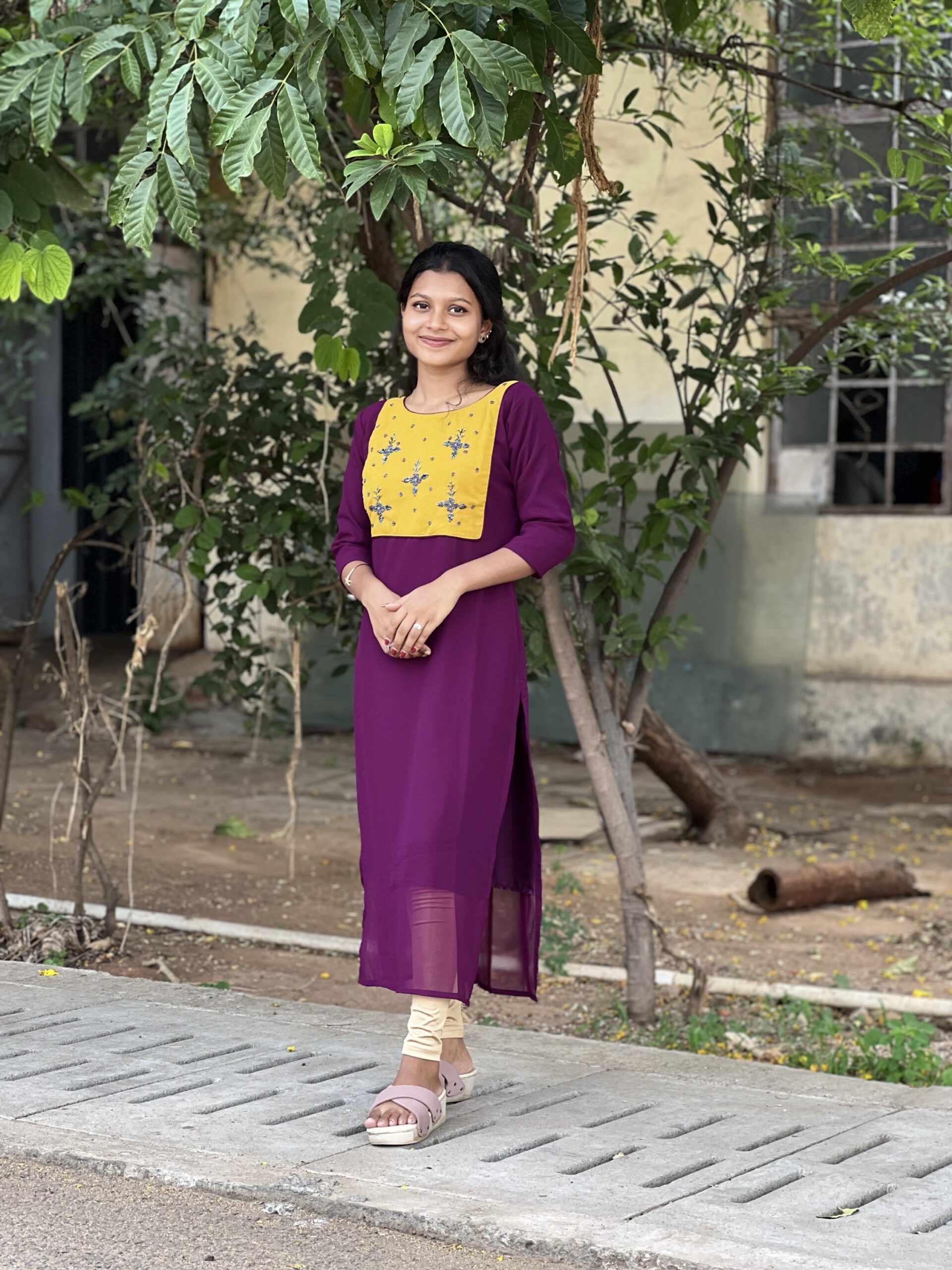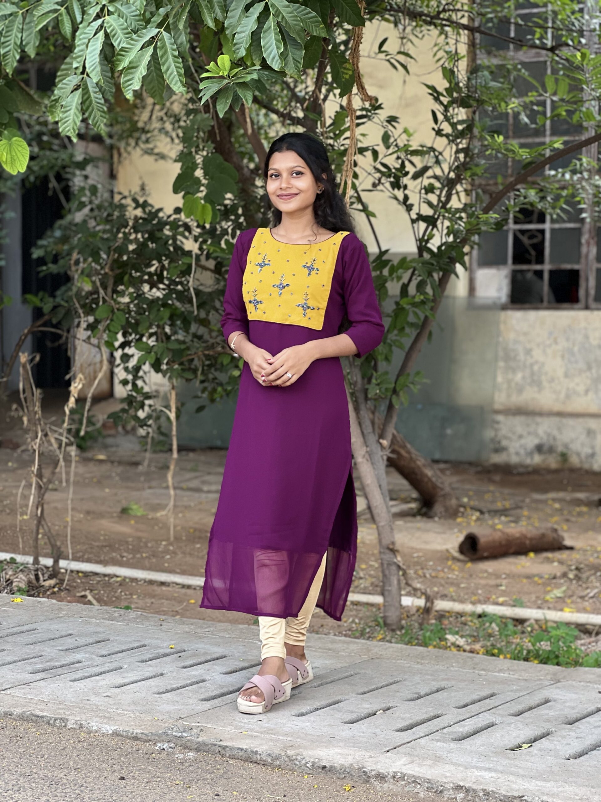 Elegant double-colored georgette kurtis featuring intricate Aari embroidery around a stylish side open neckline. Lightweight and breathable fabric offers comfort, while the unique neckline adds a touch of modern flair to a traditional silhouette. Perfect for both casual and festive occasions.